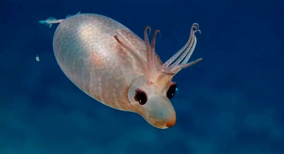 Pr├│ximo ├á ilha desabitada Palmyra, no Oceano Pac├¡fico e a um pouco mais de 1,3 mil metros de profundidade, cientistas marinhos filmaram o Helicocranchia pfefferi, uma pequena esp├®cie de molusco conhecida popularmente como ÔÇ£lula leit├úoÔÇØ.