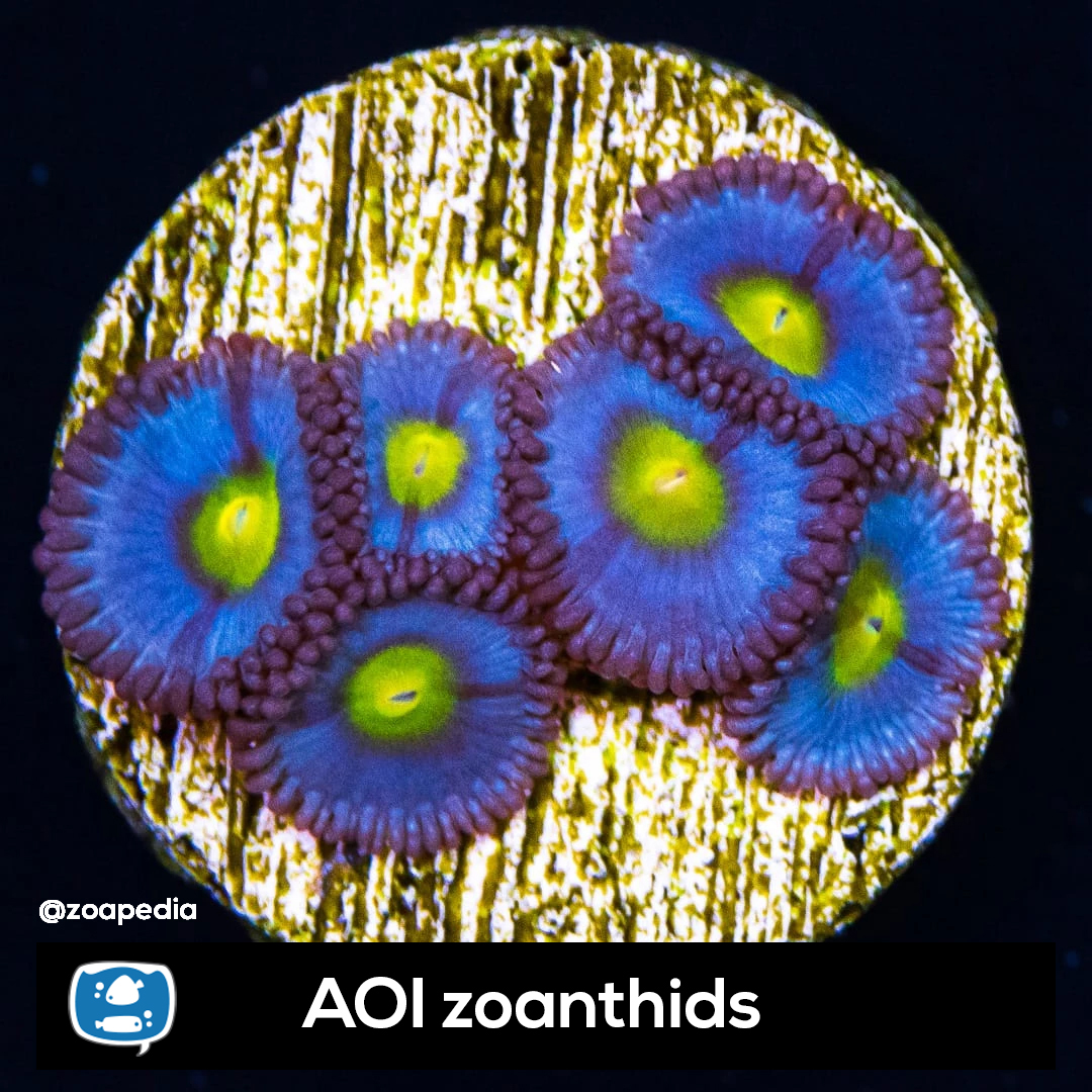 Aoi ├® um zoanthus. Suas cores incluem amarelo, azul, marrom.