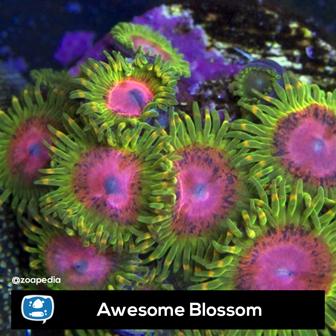Awesome Blossom ├® um zoanthus. Suas cores incluem rosa, verde.