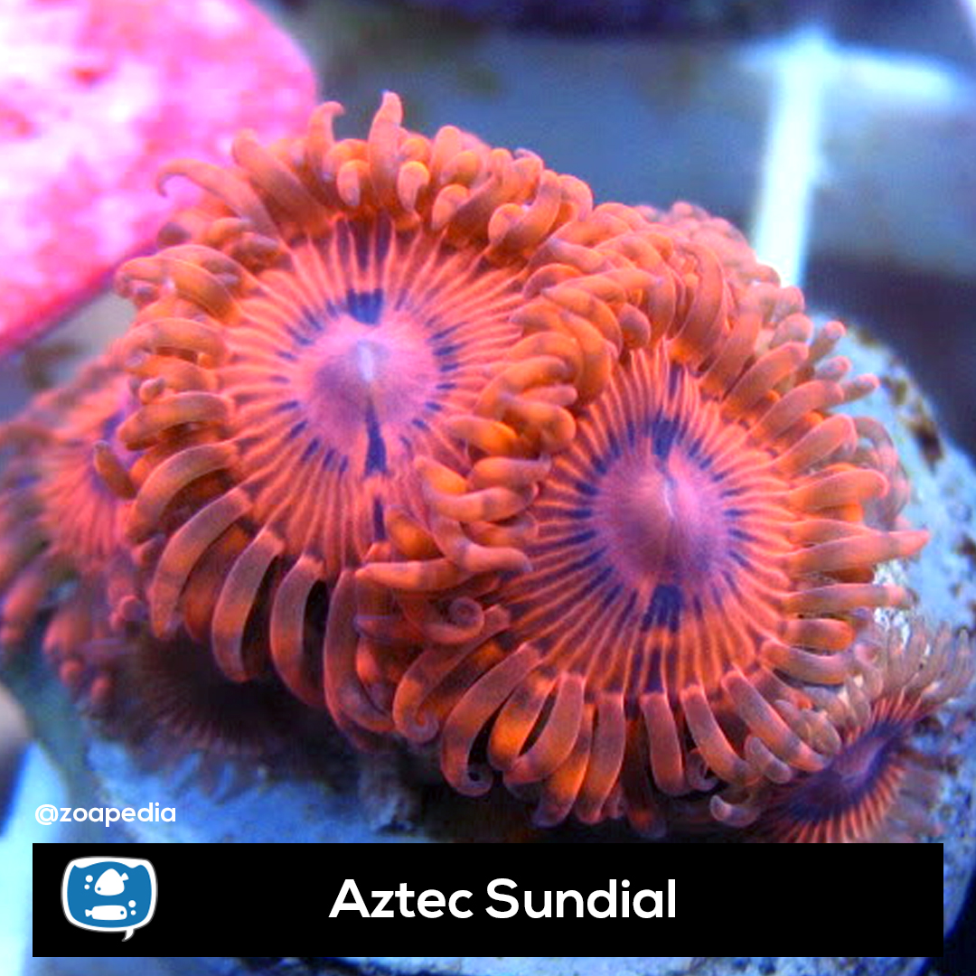Aztec Sundial ├® um zoanthus. Suas cores incluem rosa, vermelho.