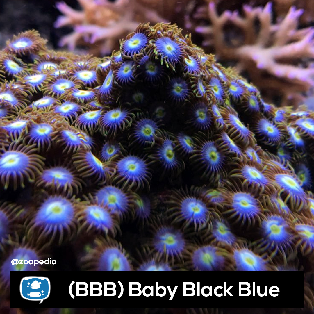Baby Black Blue ├® um zoanthus. Suas cores incluem amarelo, azul, marrom.