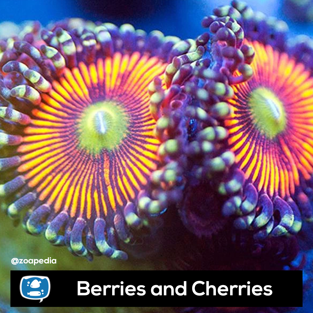 Berries and Cherries ├® um zoanthus. Suas cores incluem verde, laranja, multicolor.