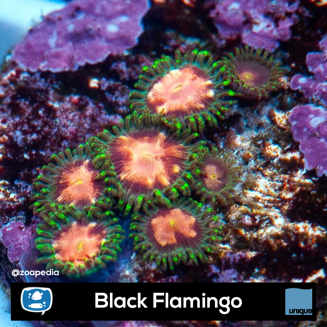 Black Flamingo ├® um zoanthus. Suas cores incluem laranja, vermelho, verde.