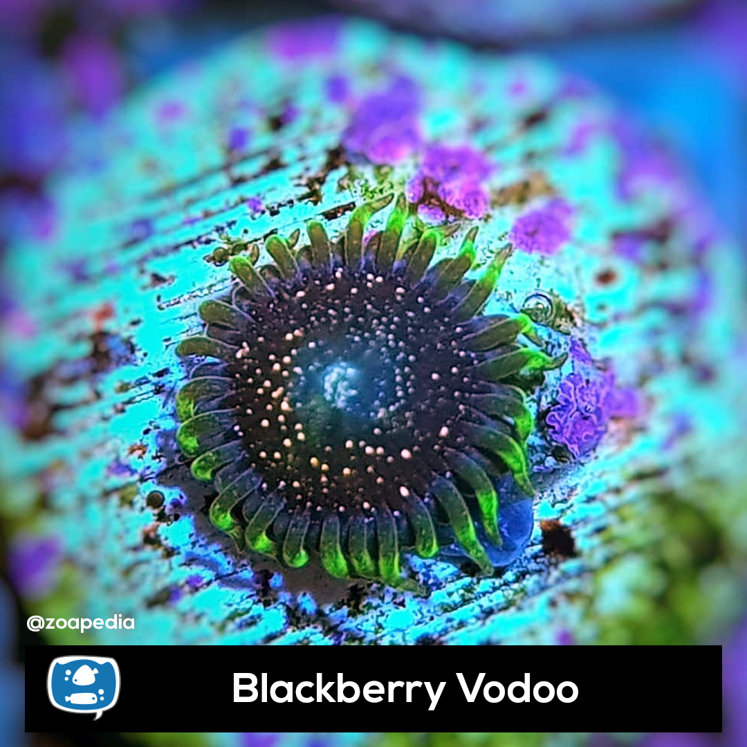 Blackberry Vodoo ├® um zoanthus. Suas cores incluem azul, multicolor, verde.