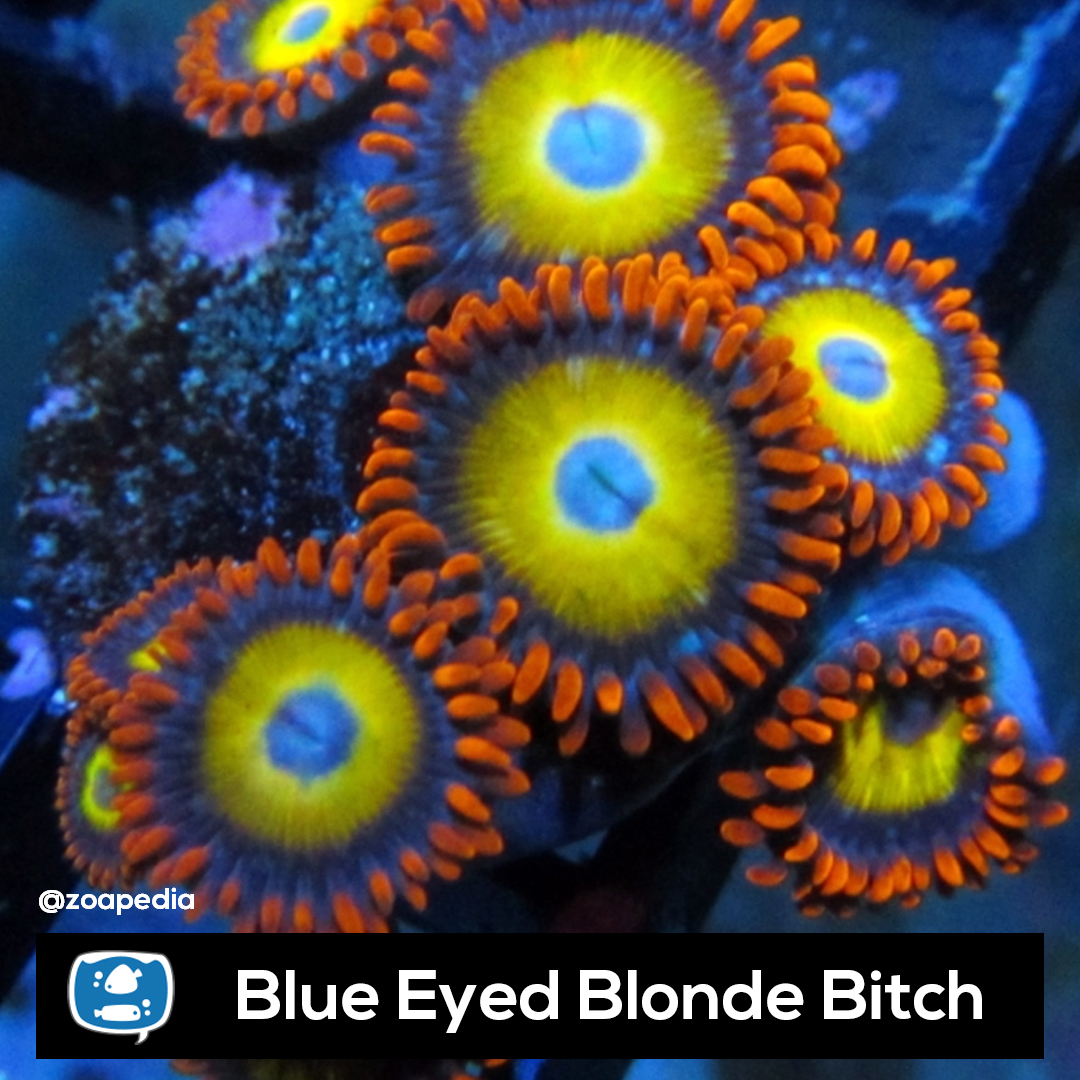 Blue Eye Blonde ├® um zoanthus. Suas cores incluem azul, amarelo, laranja.
