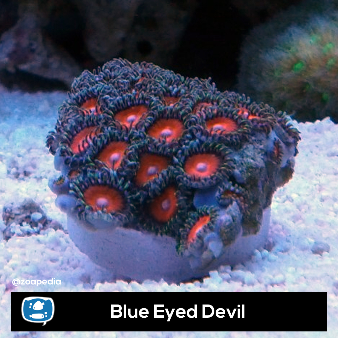Blue Eye Devil ├® um zoanthus. Suas cores incluem azul, vermelho, roxo.