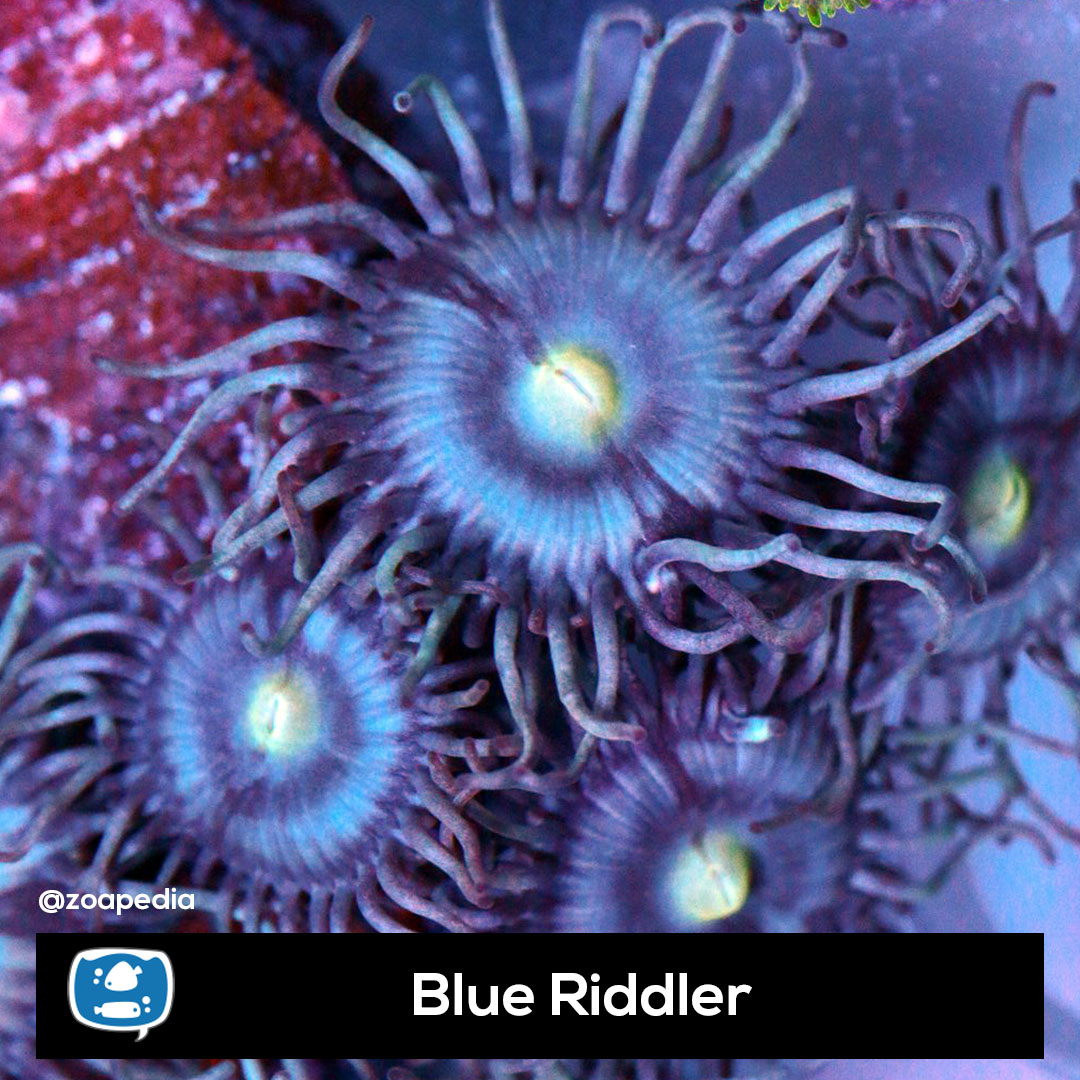 Blue Riddler ├® um zoanthus. Suas cores incluem amarelo, roxo, azul.