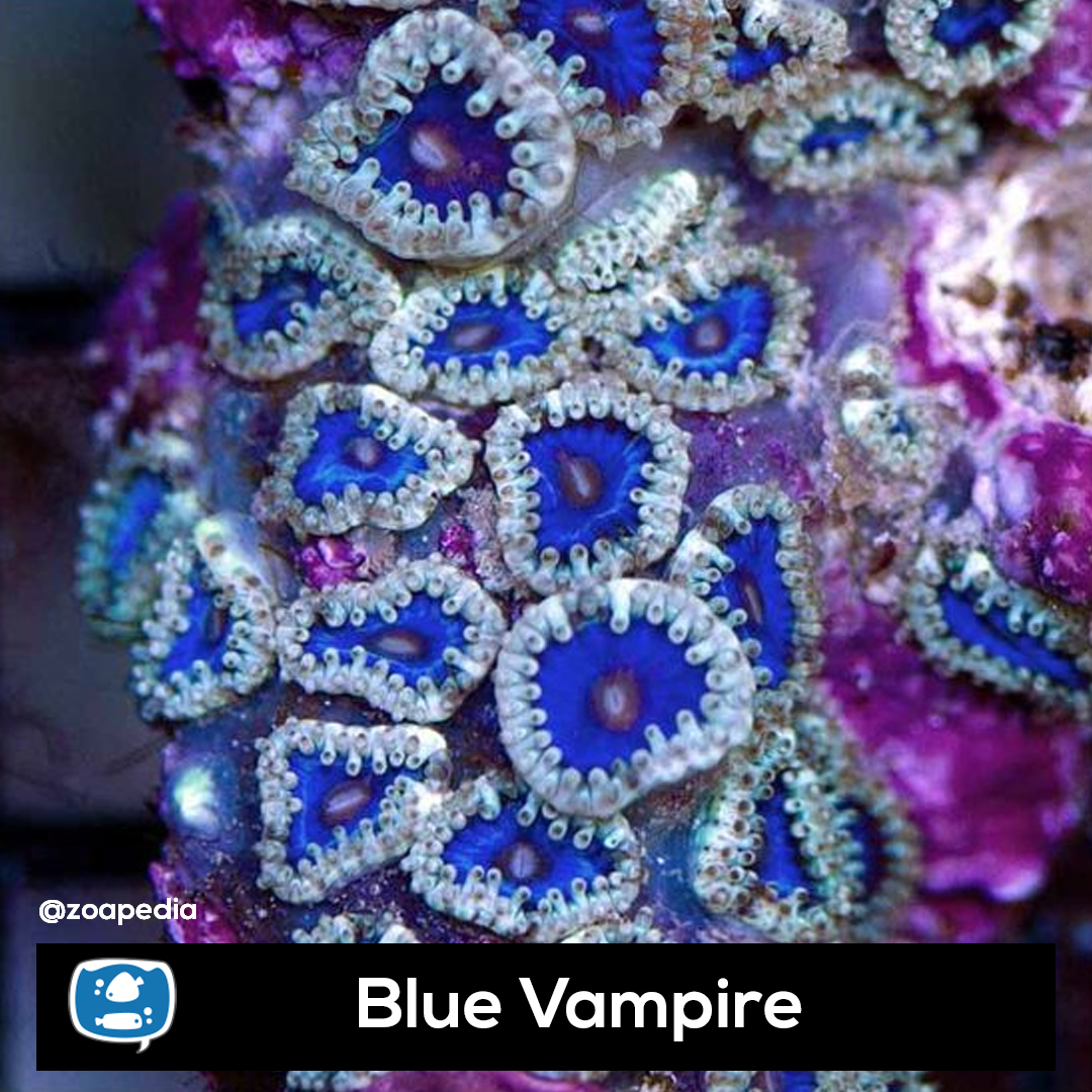 Blue Vampire ├® um zoanthus. Suas cores incluem roxo, azul, branco.