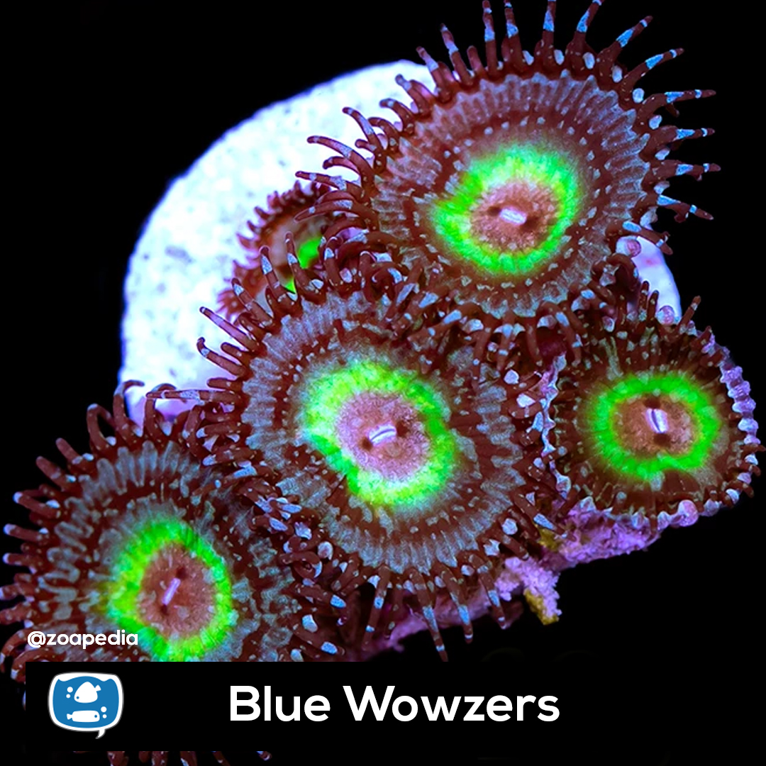 Blue Wowzers ├® um zoanthus. Suas cores incluem vermelho, verde, marrom, azul.