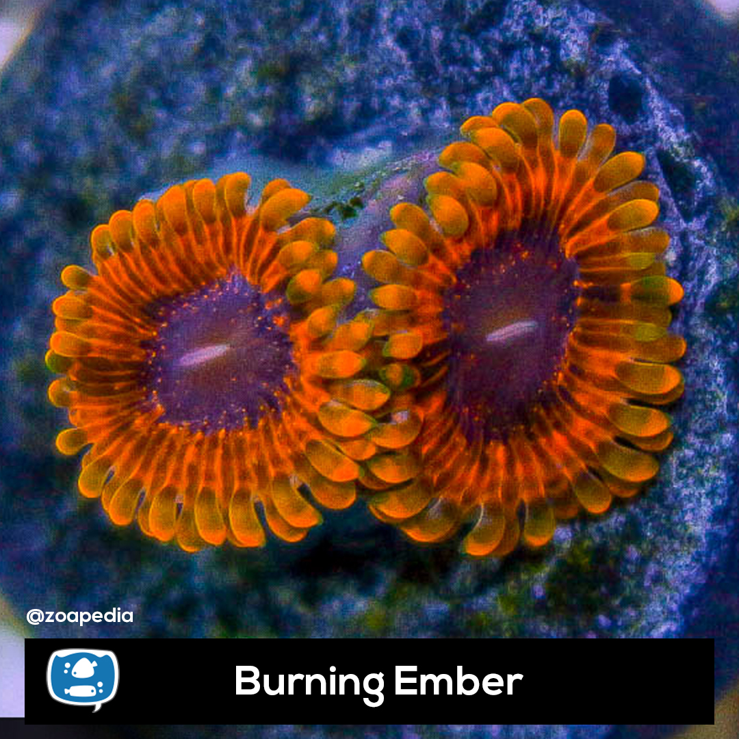 Burning Ember ├® um zoanthus. Suas cores incluem roxo, laranja.