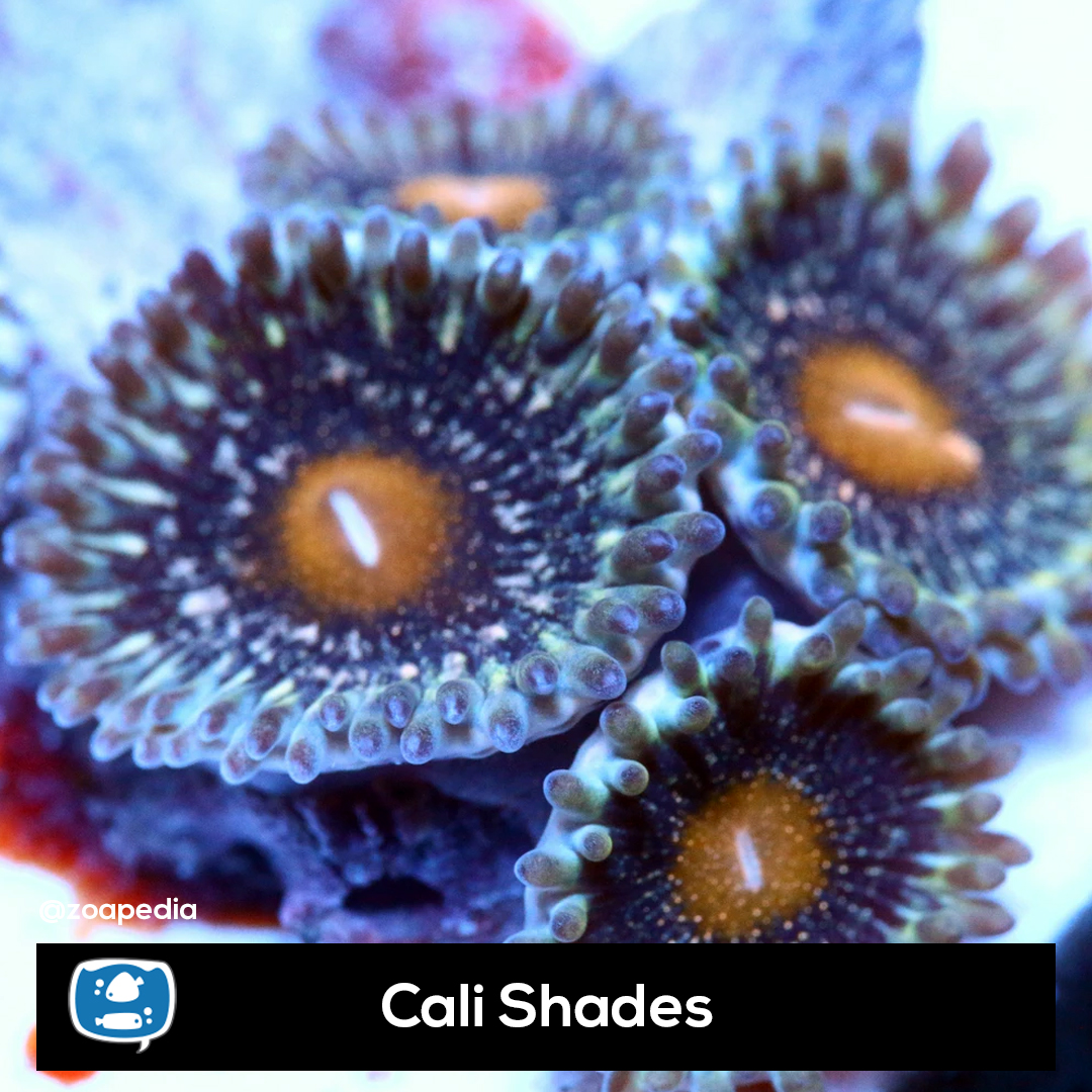 Cali Shades ├® um zoanthus. Suas cores incluem laranja, azul.