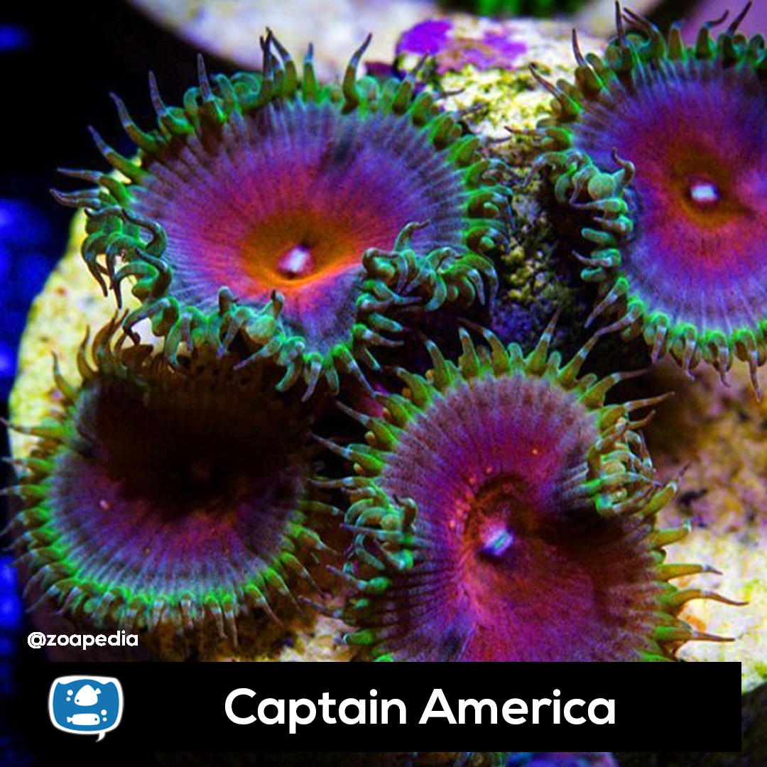 Captain America ├® um zoanthus. Suas cores incluem laranja, rosa, roxo, verde.
