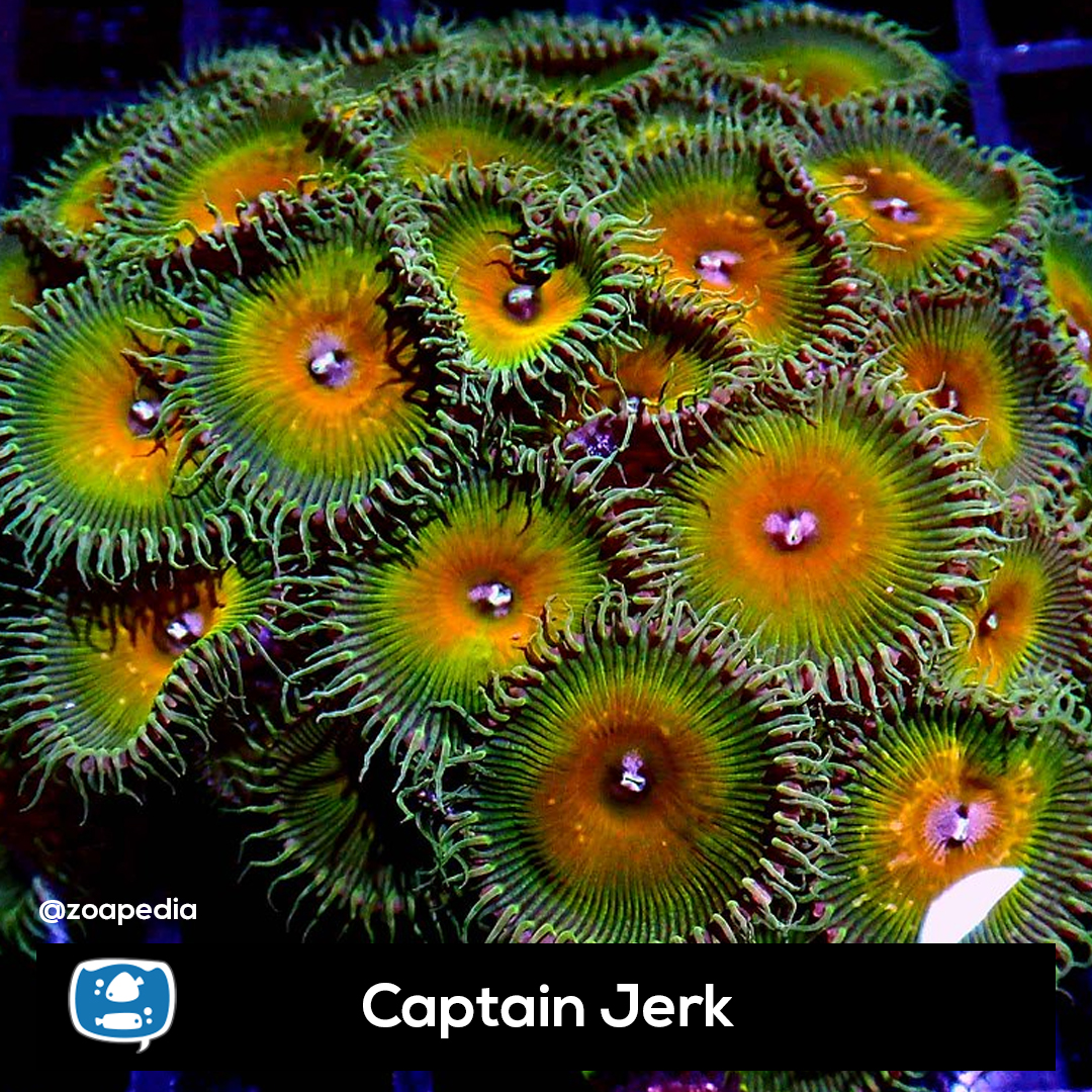Captain Jerk ├® um zoanthus. Suas cores incluem laranja, verde.