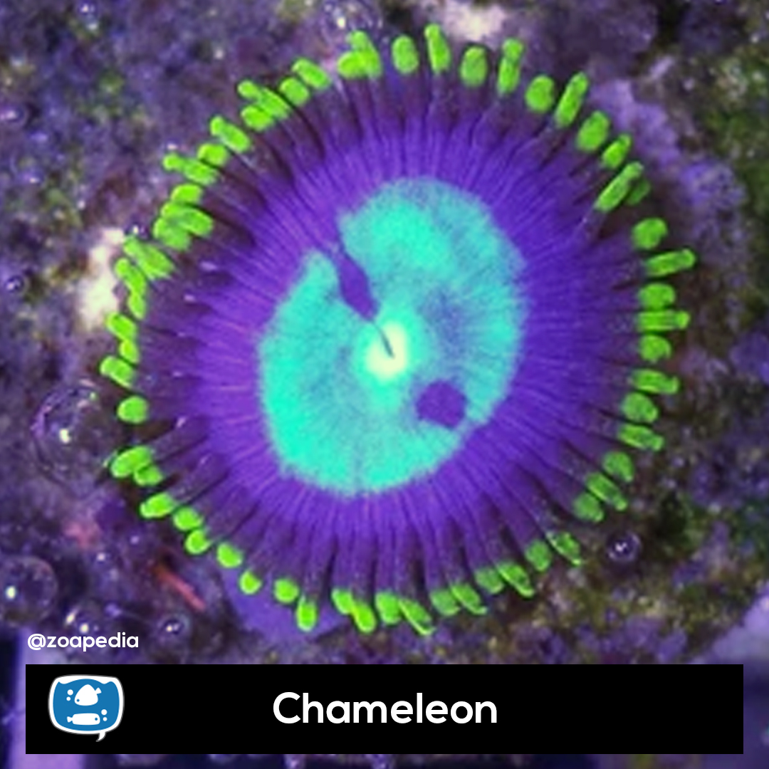 Chameleon ├® um zoanthus. Suas cores incluem azul, roxo, verde.