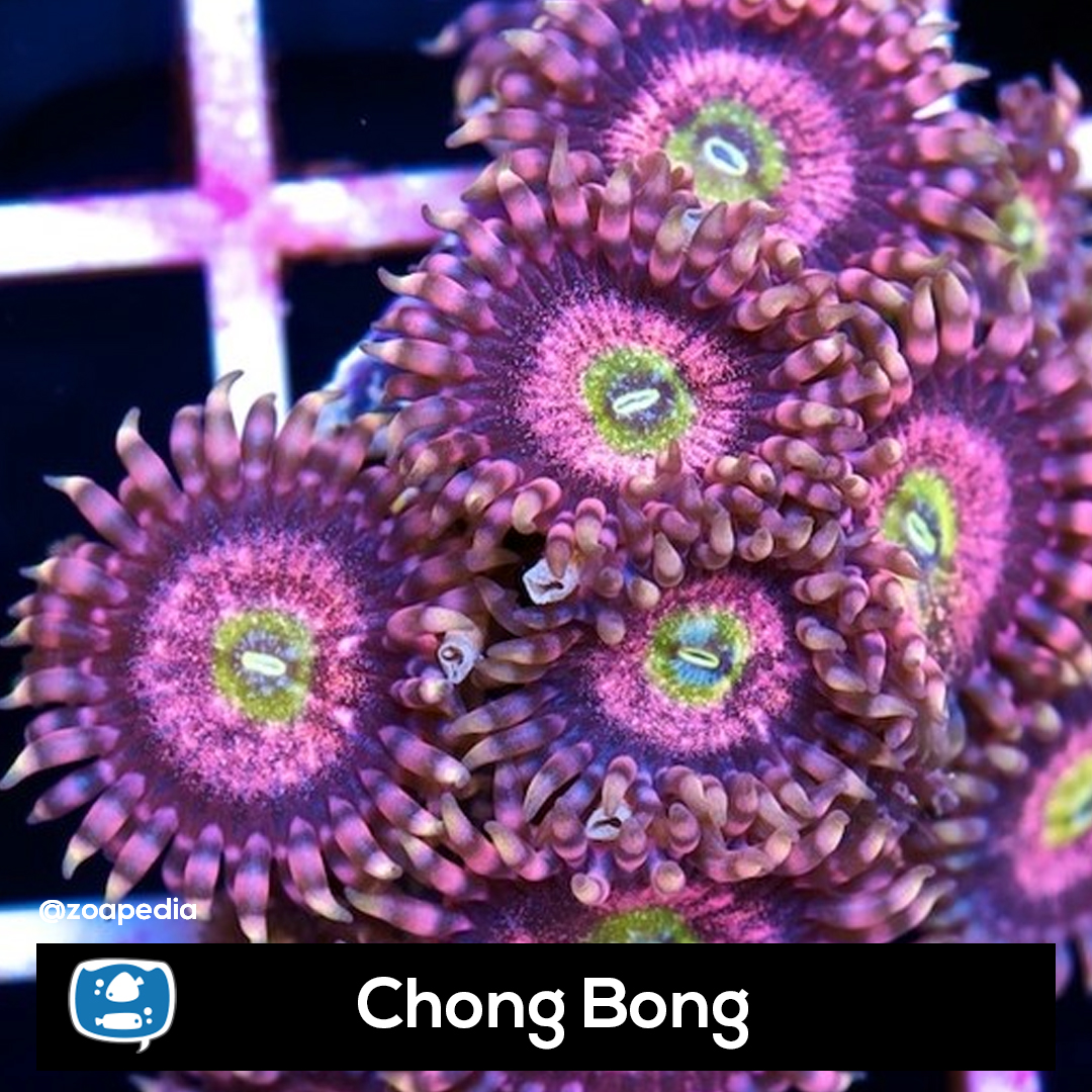 Chong Bong ├® um zoanthus. Suas cores incluem verde, rosa, roxo, multicolor.