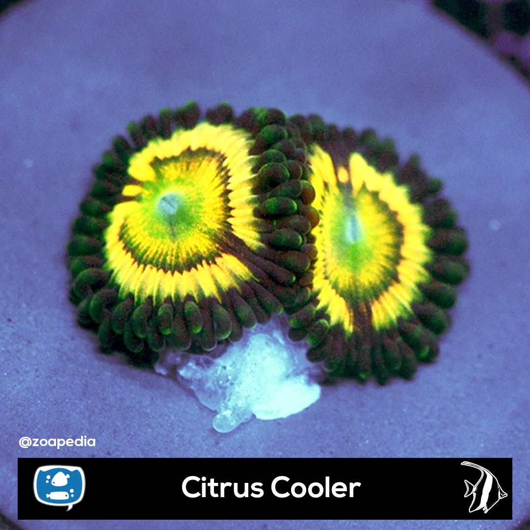 Citrus Cooler ├® um zoanthus. Suas cores incluem verde, marrom, amarelo.