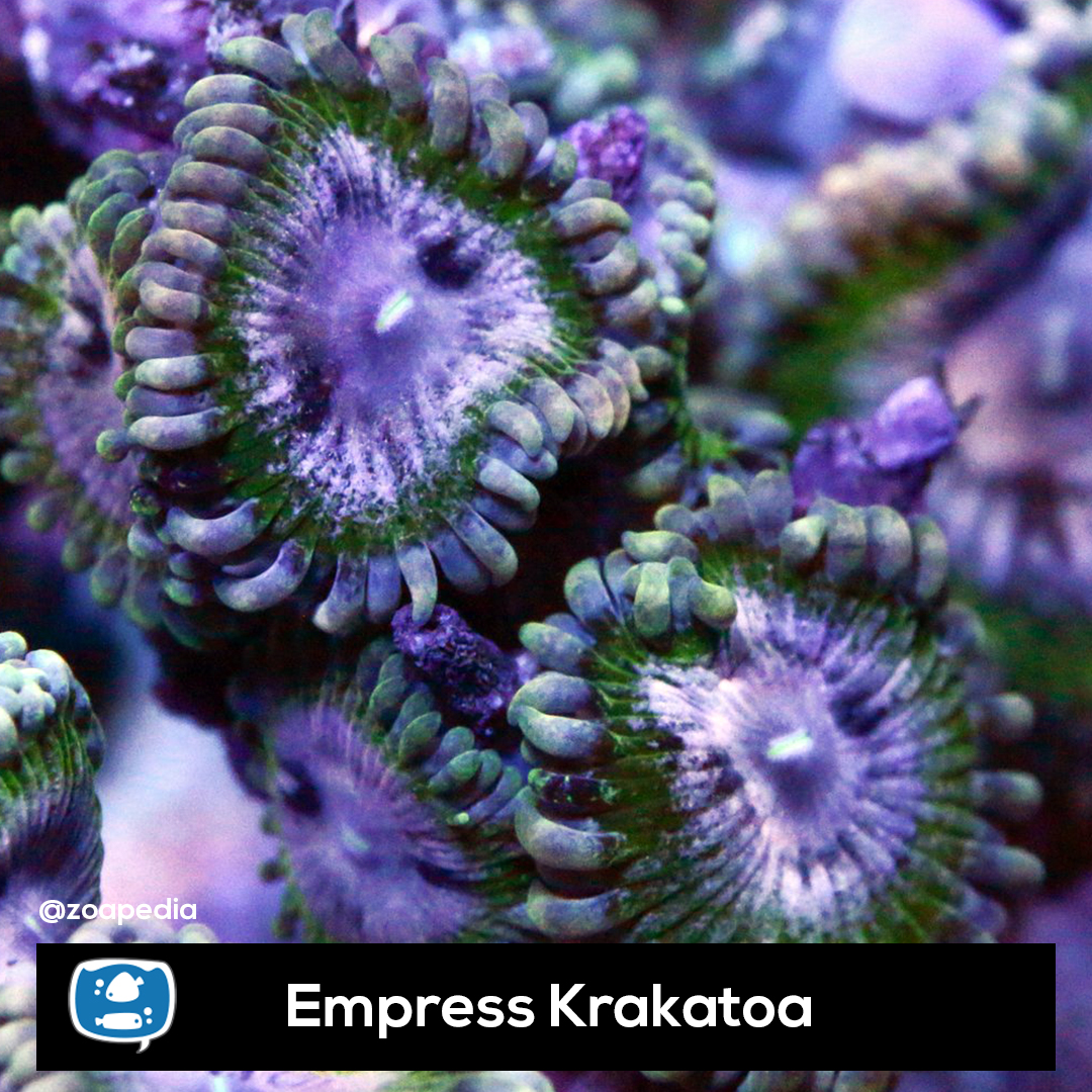 Empress Krakatoa ├® um zoanthus. Suas cores incluem roxo, verde.