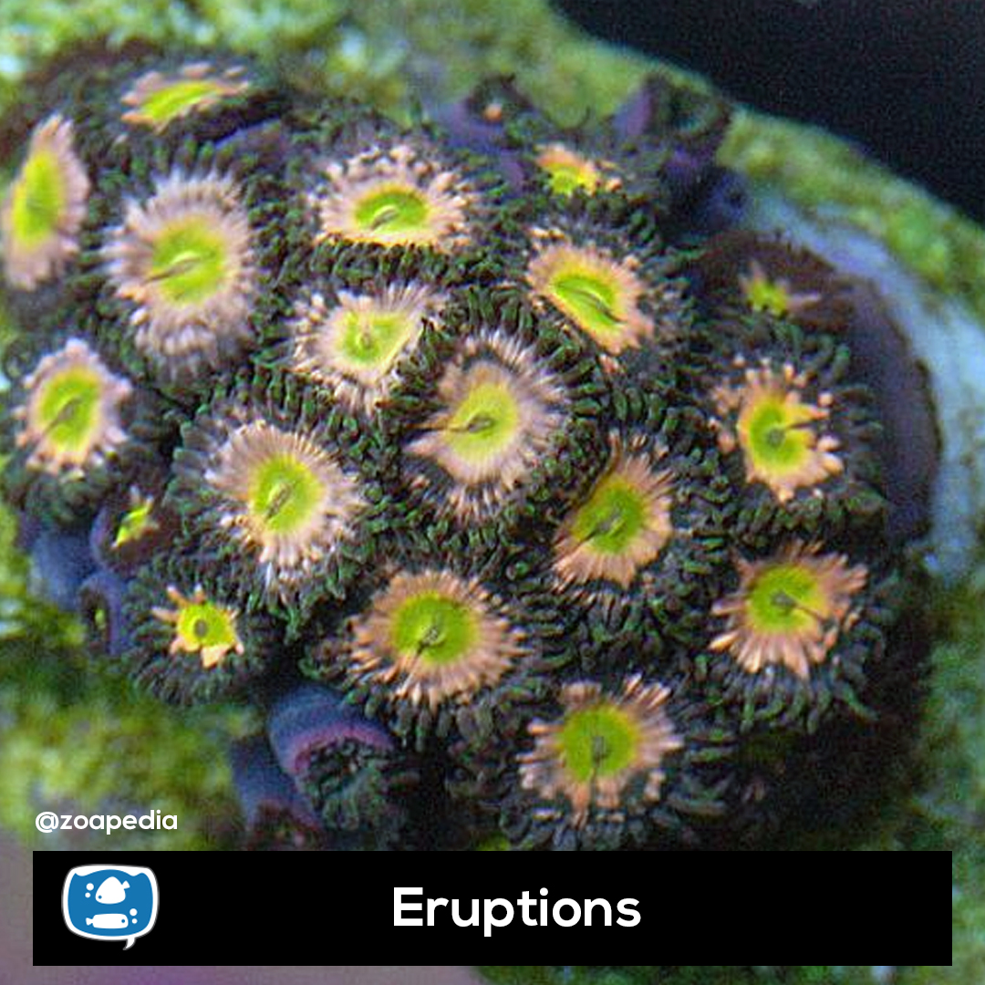 Eruptions ├® um zoanthus. Suas cores incluem amarelo, rosa, verde.