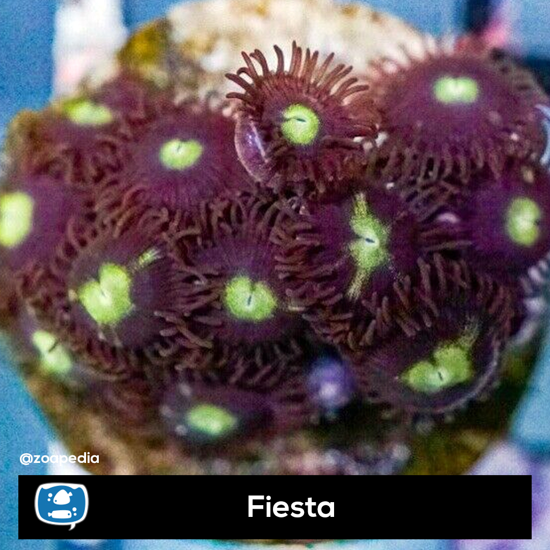 Fiesta ├® um zoanthus. Suas cores incluem verde, roxo.