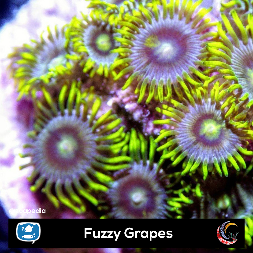 Fuzzy Grapes ├® um zoanthus. Suas cores incluem verde, roxo, azul.