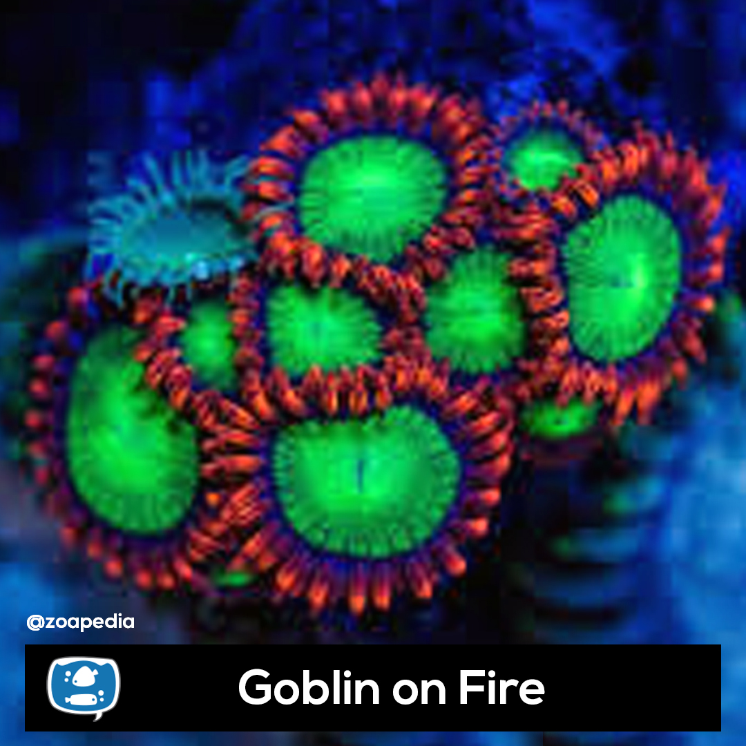 Goblins on Fire ├® um zoanthus. Suas cores incluem verde, roxo, laranja.