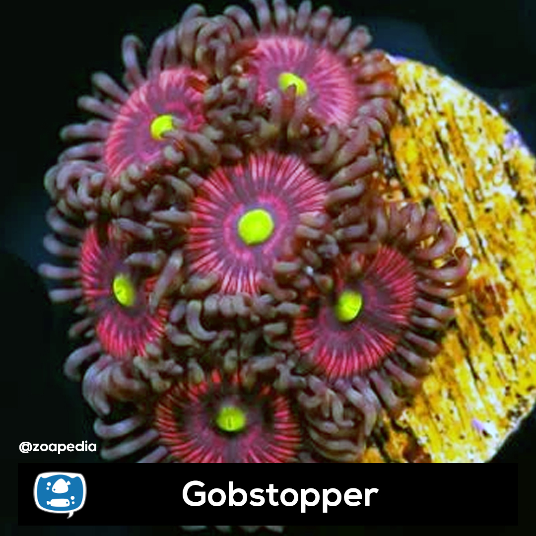 Gobstopper ├® um zoanthus. Suas cores incluem amarelo, vermelho, marrom.