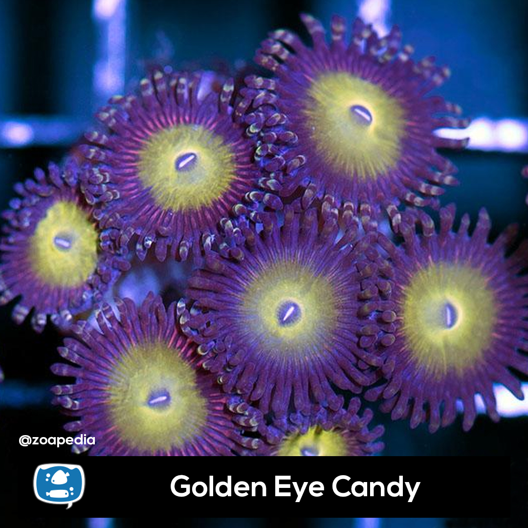 Golden Eye Candy ├® um zoanthus. Suas cores incluem dourado, roxo, multicolor.