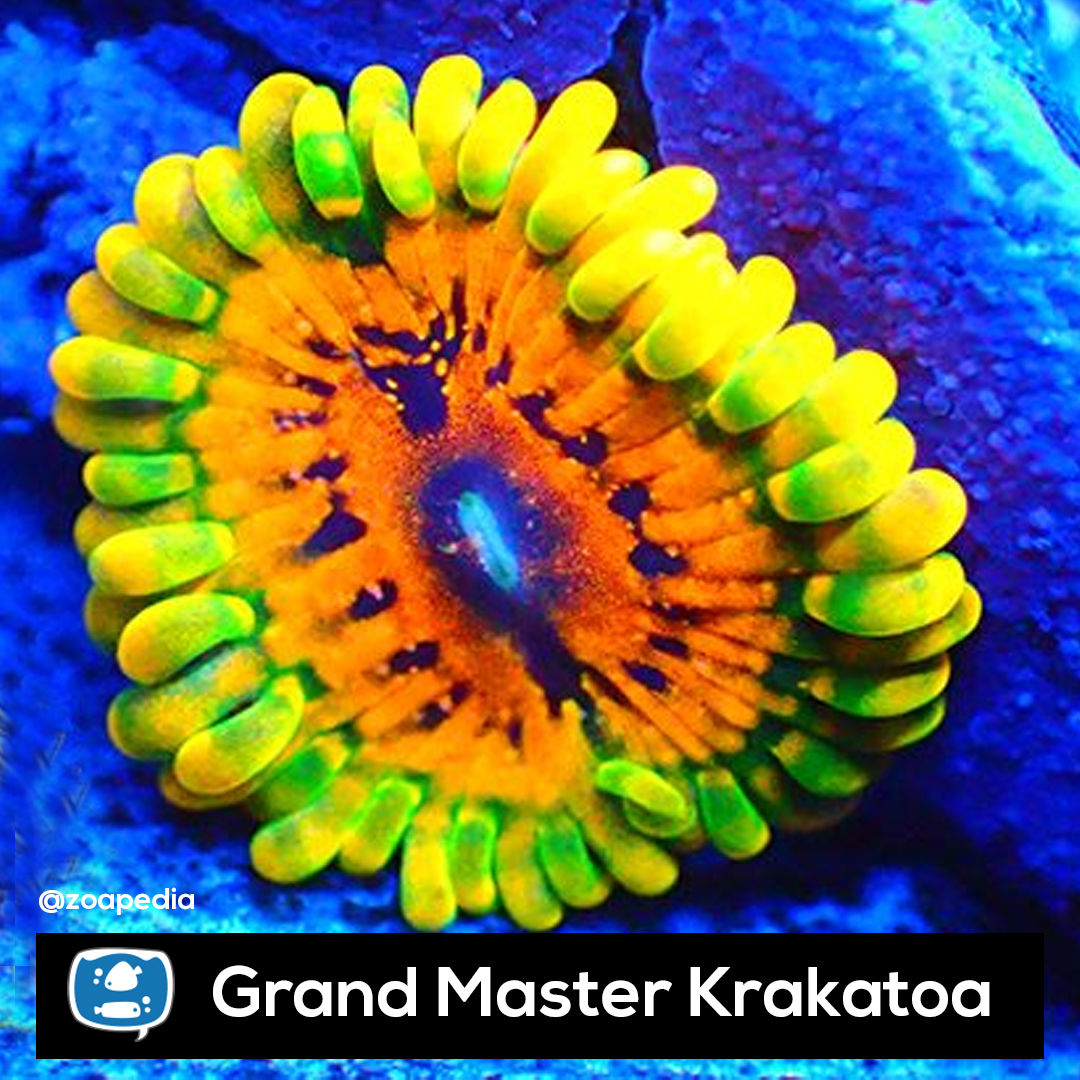 Grand Master Krakatoa ├® um zoanthus. Suas cores incluem laranja, multicolor.