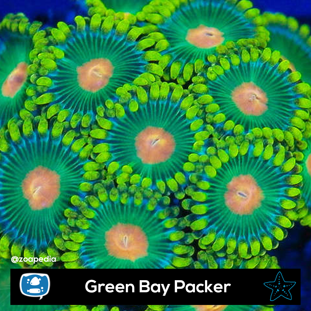 Green Bay Packer ├® um zoanthus. Suas cores incluem laranja, verde.
