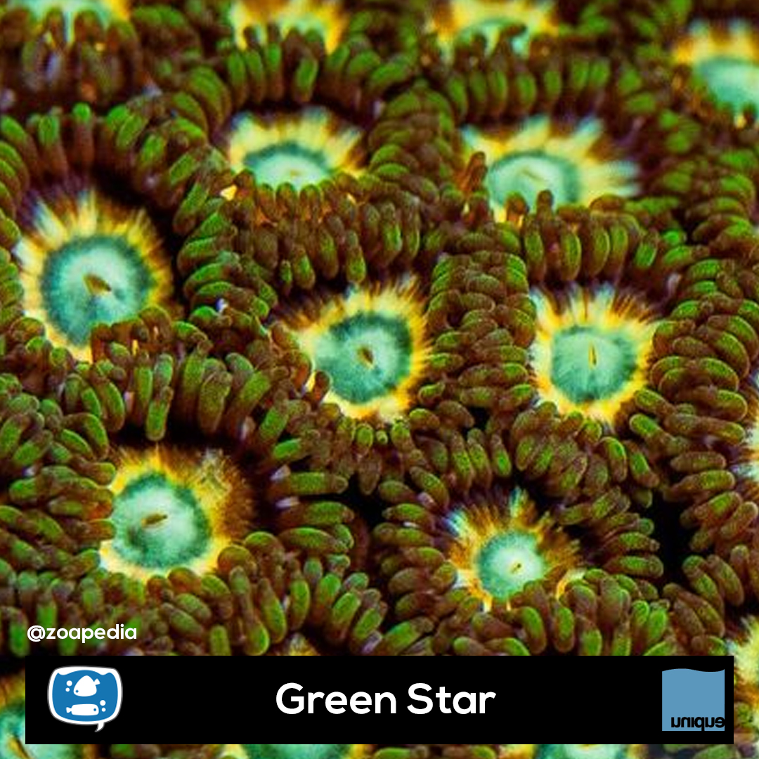 Green Star ├® um zoanthus. Suas cores incluem verde, amarelo, multicolor.