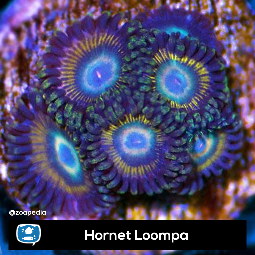 Hornet Loompa ├® um zoanthus. Suas cores incluem azul, dourado, verde.