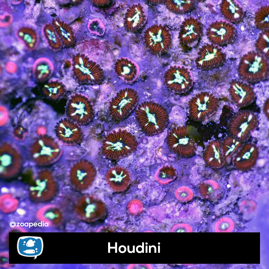 Houdini ├® um zoanthus. Suas cores incluem verde, vermelho.