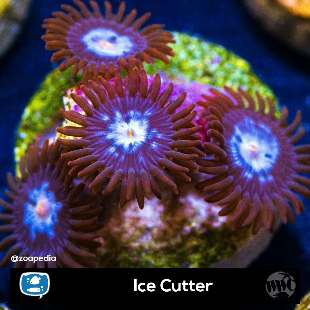 Ice Cutter ├® um zoanthus. Suas cores incluem branco, azul, roxo, laranja.