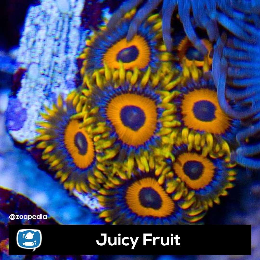 Juicy Fruit ├® um zoanthus. Suas cores incluem azul, laranja, amarelo.