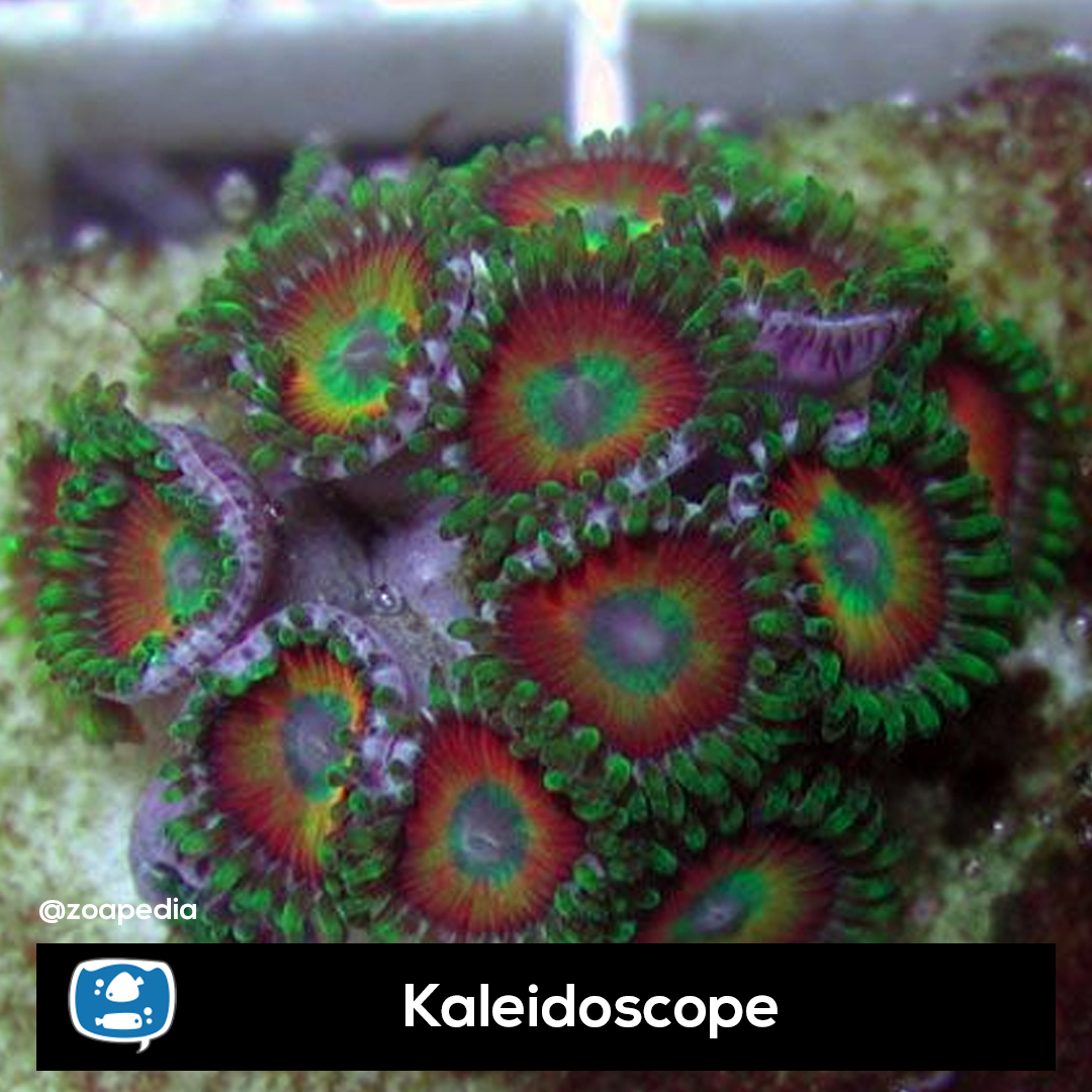 Kaleidoscope ├® um zoanthus. Suas cores incluem verde, vermelho.