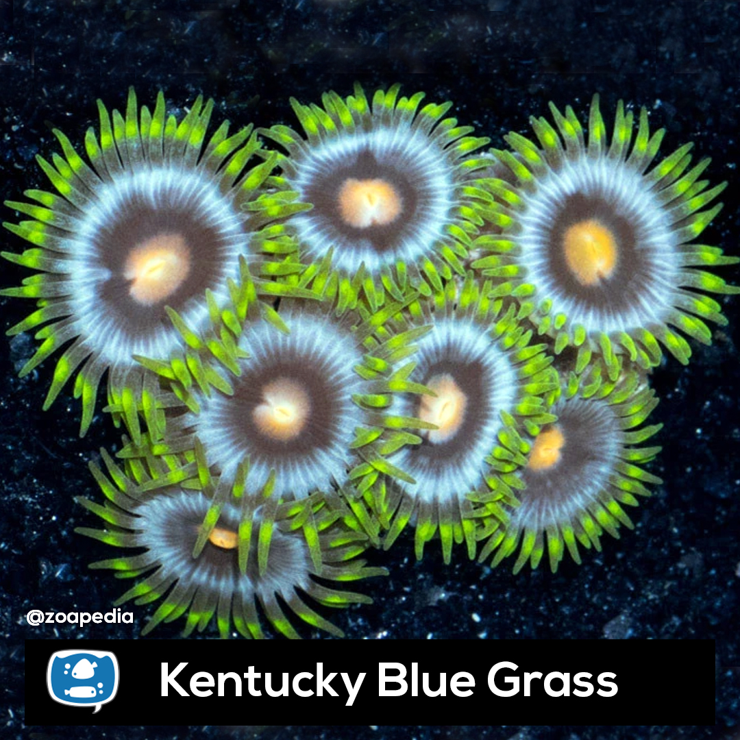 Kentucky Blue Grass ├® um zoanthus. Suas cores incluem amarelo, preto, azul, verde.