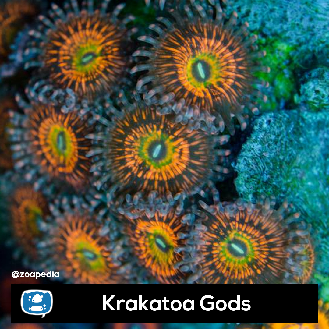 Krakatoa Gods ├® um zoanthus. Suas cores incluem verde, laranja, multicolor.