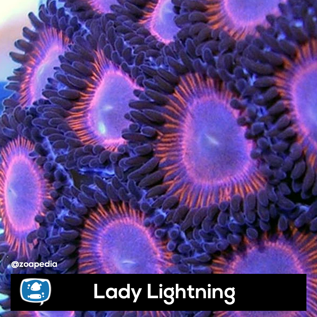 Lady Lightning ├® um zoanthus. Suas cores incluem roxo, rosa, laranja, azul.