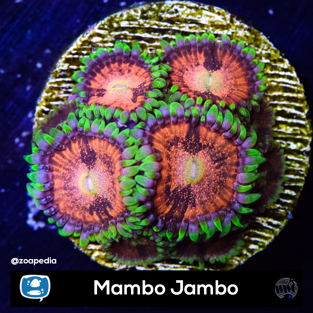 Mambo Jambo ├® um zoanthus. Suas cores incluem laranja, roxo, verde.