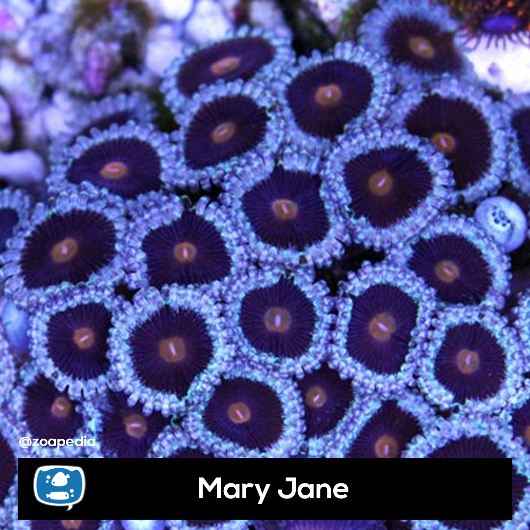 Mary jane ├® um zoanthus. Suas cores incluem laranja, roxo, azul.