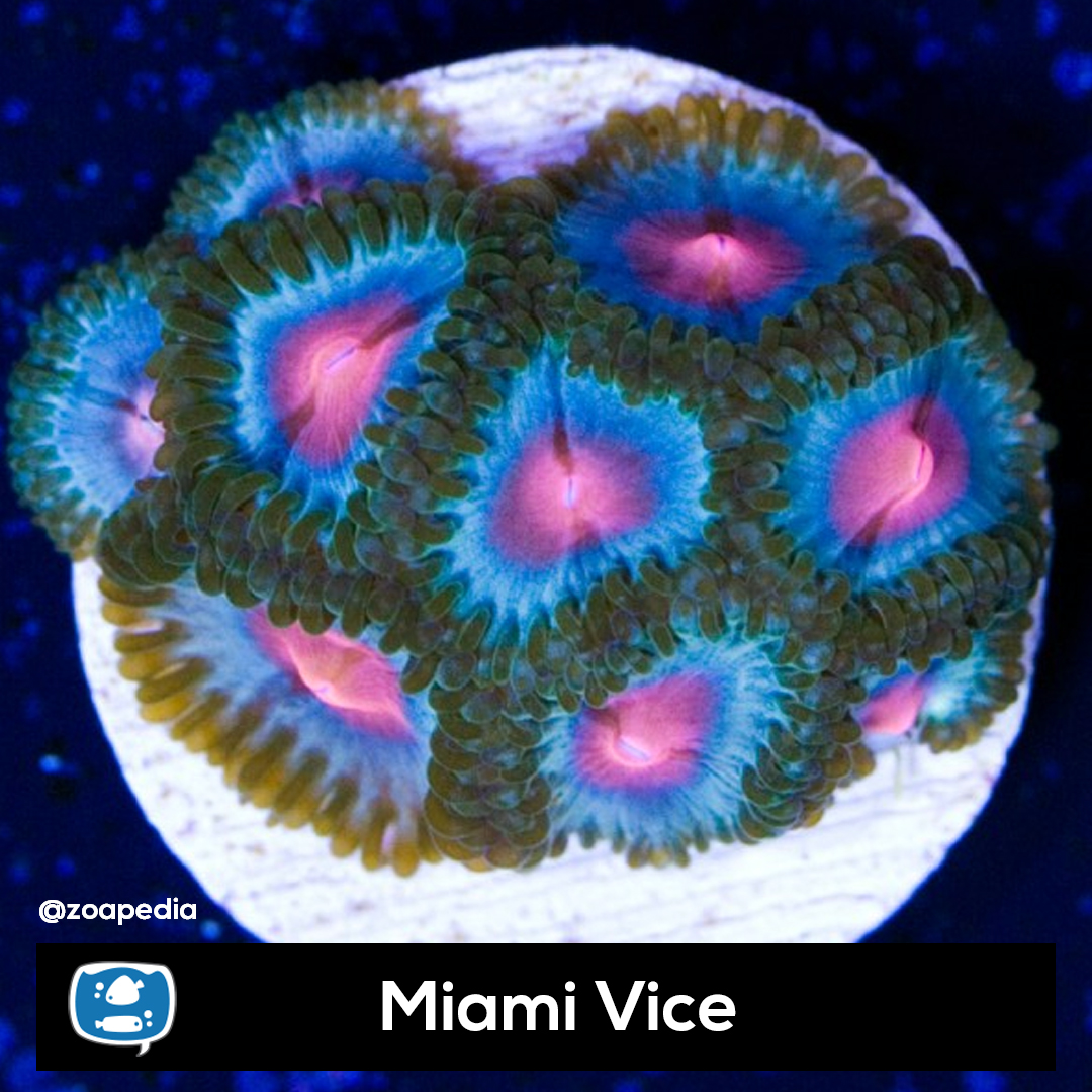 Miami Vice ├® um zoanthus. Suas cores incluem rosa, azul, verde.