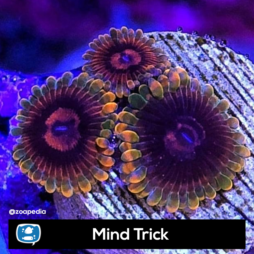 Mind Trick ├® um zoanthus. Suas cores incluem rosa, roxo, laranja.