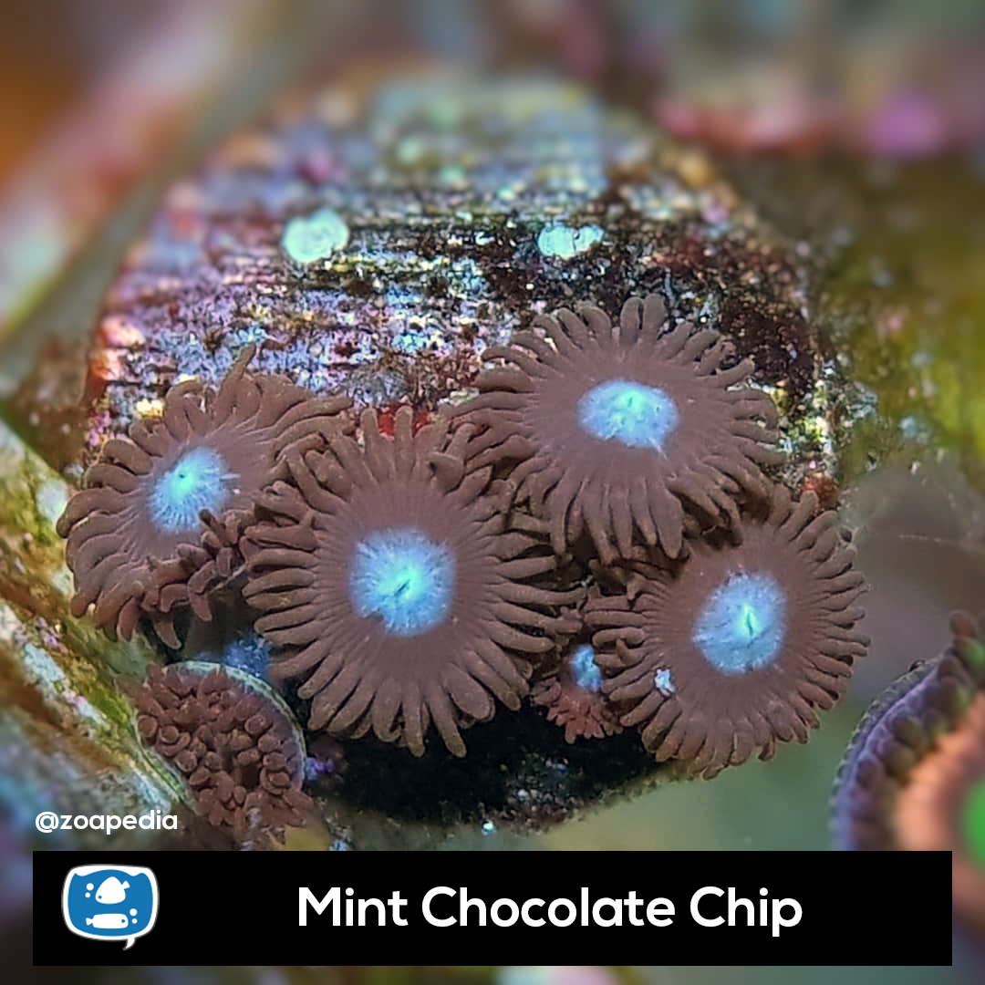 Mint Chocolate Chip ├® um zoanthus. Suas cores incluem azul, marrom.