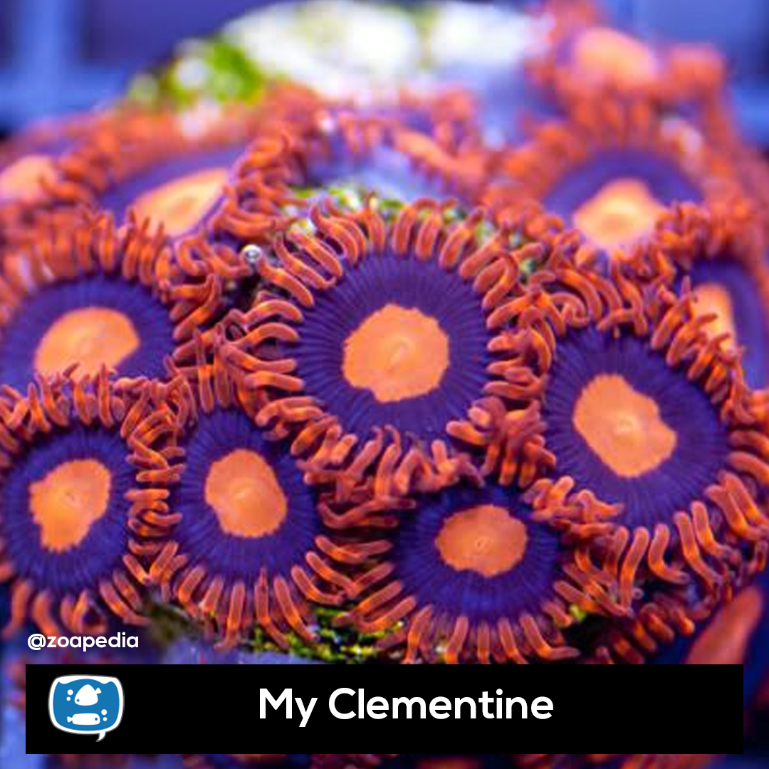 My Clementine ├® um zoanthus. Suas cores incluem laranja, roxo.