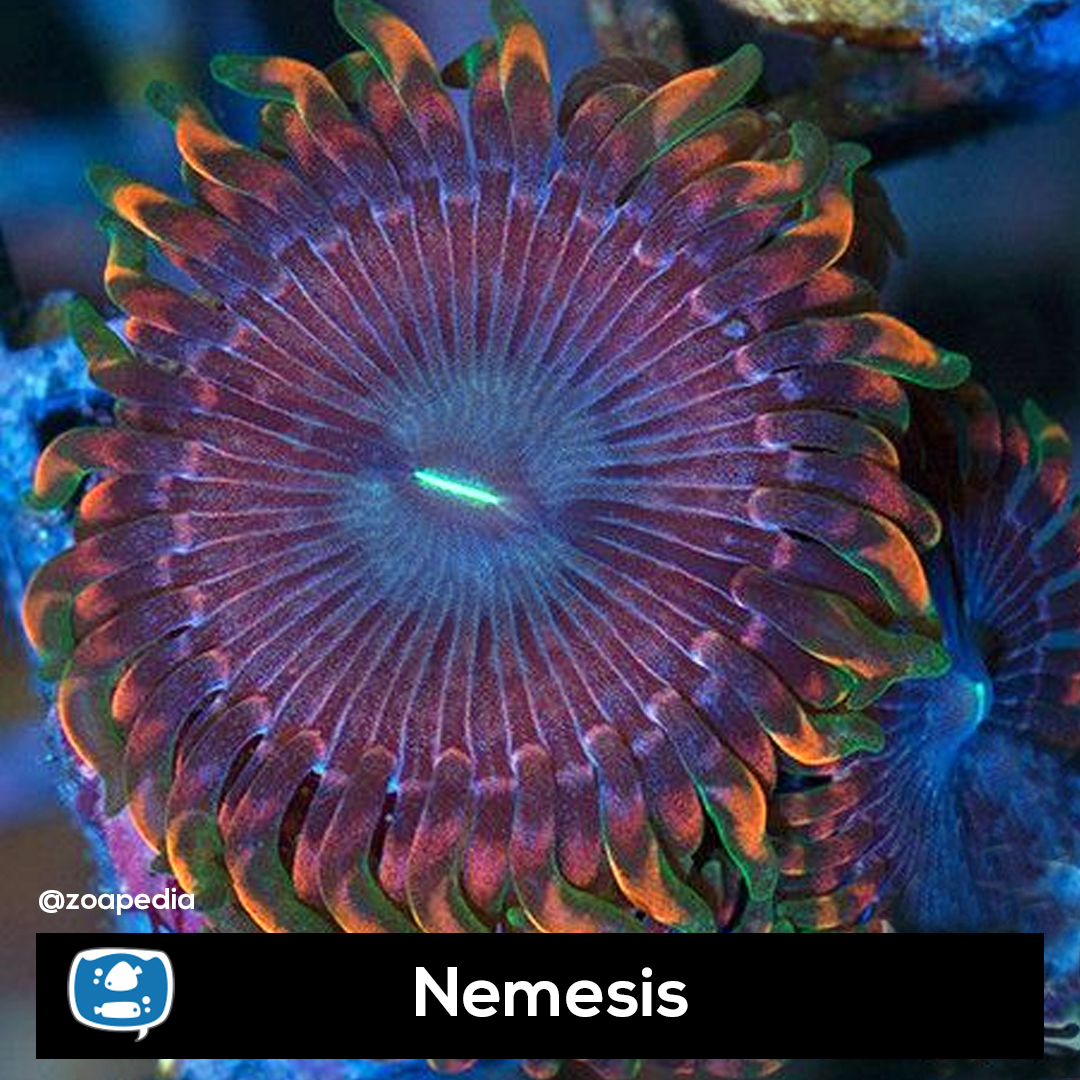 Nemesis ├® um zoanthus. Suas cores incluem azul, vermelho, multicolor.