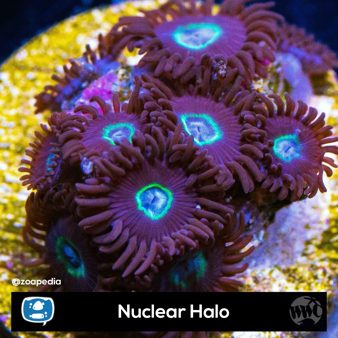 Nuclear Halo ├® um zoanthus. Suas cores incluem azul, verde, roxo.