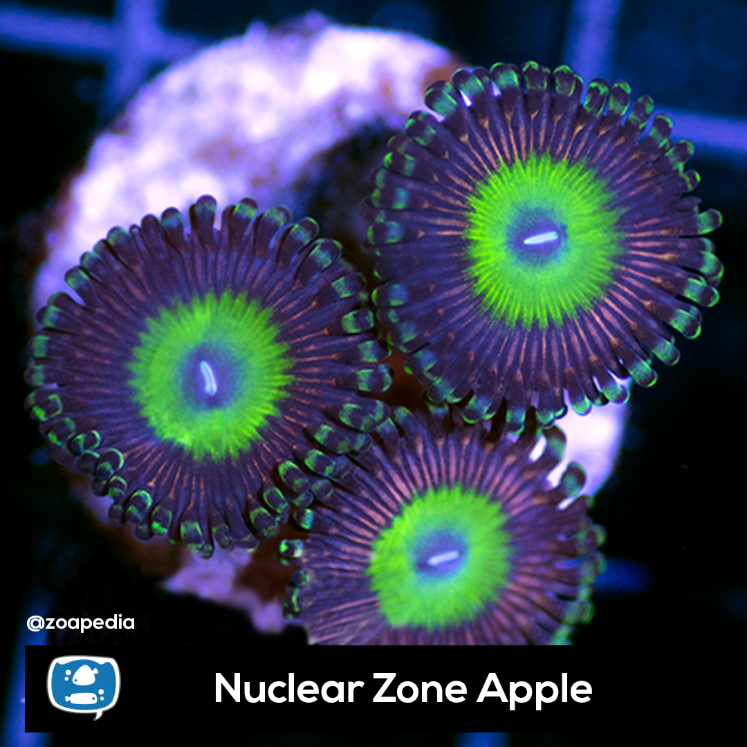 Nuclear Zone Apple ├® um palythoa. Suas cores incluem azul, verde, roxo.