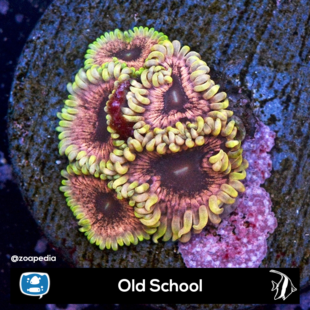 Old School ├® um zoanthus. Suas cores incluem preto, laranja, amarelo.