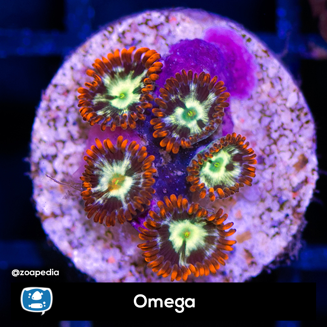 Omega ├® um zoanthus. Suas cores incluem verde, multicolor, laranja.