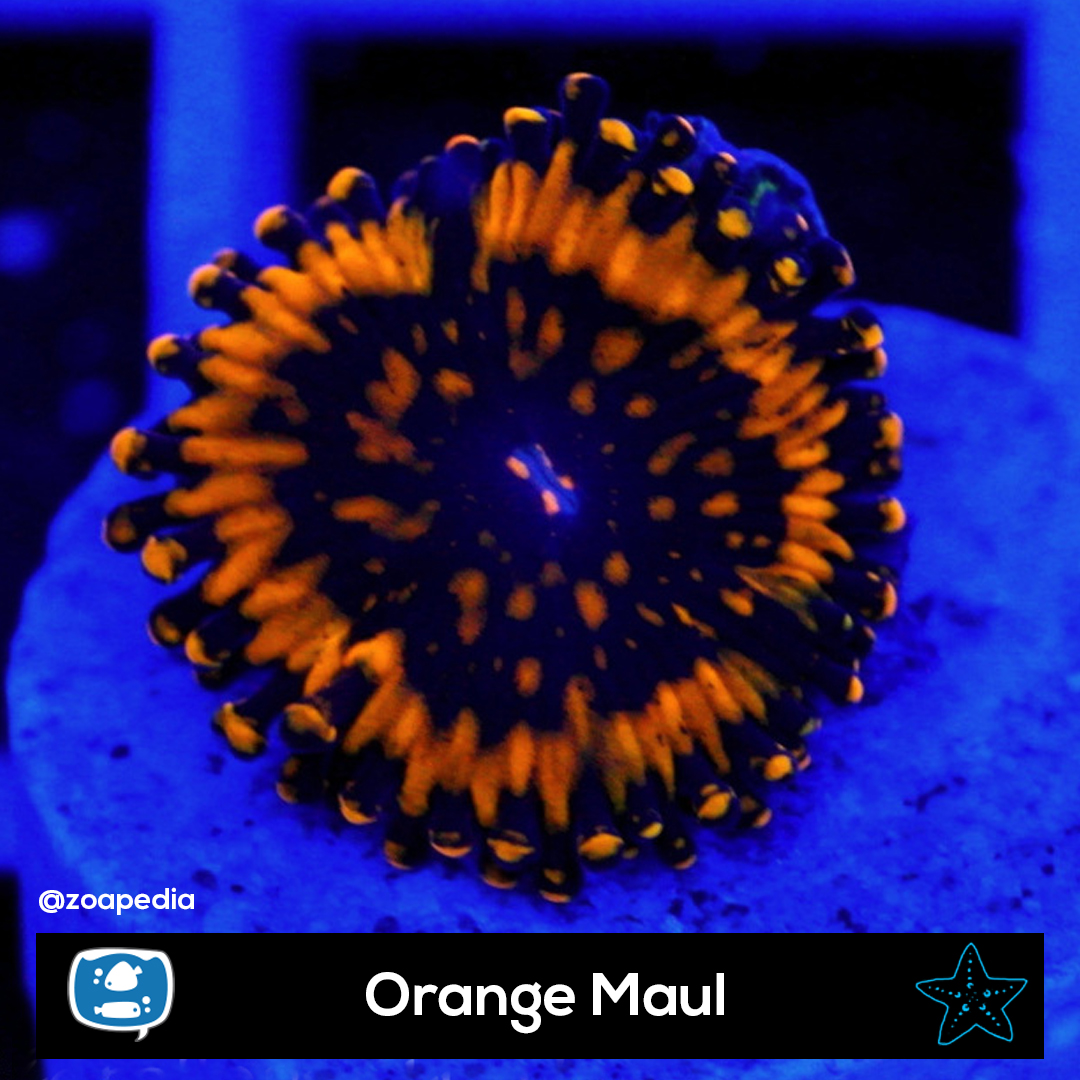 Orange Maul ├® um zoanthus. Suas cores incluem preto, laranja, multicolor.